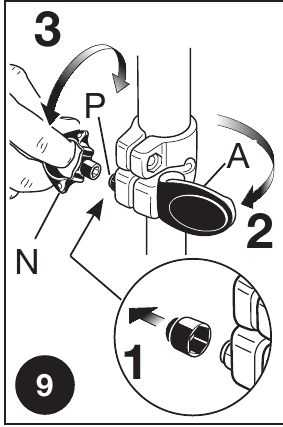 - gire el tornillo "P" en el sentido de las agujas del reloj utilizando la llave especial "N" proporcionada en una de las patas del trípode.