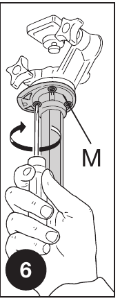 Monte el cabezal de la cámara en la placa en la parte superior de la columna central a través del tornillo de montaje de 3/8" (gire el cabezal del tornillo en el sentido de las agujas del reloj). Luego, levante la columna central y, con un destornillador pequeño, apriete los tres tornillos de fijación "M" (suministrados sin montar) contra la base del cabezal, teniendo cuidado de no forzarlos. Esta característica única funciona especialmente bien con los cabezales Manfrotto debido a la base especialmente diseñada, que evita que el cabezal se desenrosque accidentalmente. Para quitar el cabezal, afloje los tornillos de fijación "M" y desenrosque el cabezal de la columna en sentido antihorario).
