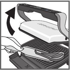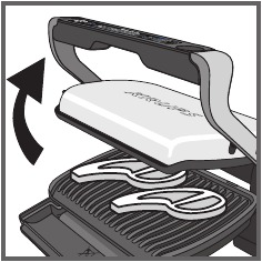 30-31. Cierre el aparato para iniciar el ciclo de cocción. La parrilla se calienta continuamente hasta la temperatura seleccionada. Compruebe regularmente la cocción abriendo la parrilla.