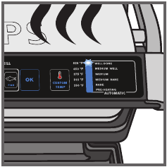 - Pulse "OK" (ACEPTAR) para iniciar el precalentamiento. Durante esta fase, el indicador de temperatura (en modo MANUAL) o el indicador de PREHEAT (precalentamiento) (en modo automático) parpadeará. Esta etapa es obligatoria incluso si su aparato parece caliente.