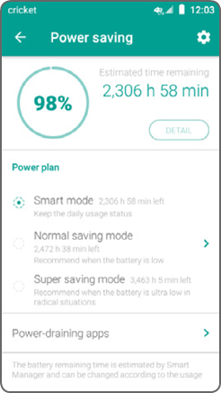 Ahorro de energía: En el menú Ajustes, toca Administrador inteligente y, a continuación, toca Ahorro de energía para gestionar tu plan de energía.