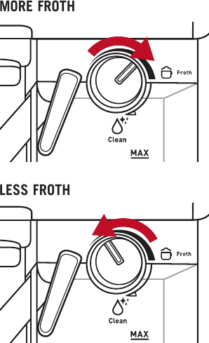 Antes de preparar su latte, ajuste la cantidad de espuma según su preferencia girando la perilla de control de espuma hacia la derecha para obtener más espuma y hacia la izquierda para obtener menos espuma.
