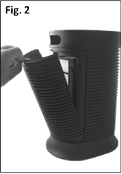 - Antes de usar su nuevo purificador de aire, debe quitar la envoltura que cubre el/los filtro(s). Asegúrese de que el purificador de aire esté APAGADO y desenchufado. Mientras presiona la pestaña en la parte superior de la rejilla trasera, tire de la rejilla hacia usted y retírela de la unidad y déjela a un lado (consulte la Fig. 2). Sujete los lados de cada marco del filtro cerca de su extremo superior y tire hacia afuera. Repita para el segundo filtro si corresponde.