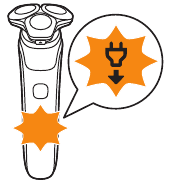 - Mientras el aparato está en modo de carga rápida, las luces del indicador de estado de la batería se encienden una tras otra. Después de aproximadamente 5 minutos, la luz inferior del indicador de estado de la batería parpadea. La batería ahora contiene suficiente energía para un afeitado completo.
