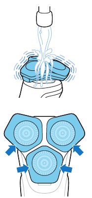 Puede utilizar este aparato tanto en seco como en húmedo, o incluso en la ducha. Para un afeitado en húmedo, aplique un poco de agua y espuma o gel de afeitar sobre la piel y enjuague los cabezales de afeitado bajo el grifo con agua tibia antes de seguir los pasos que se indican a continuación.