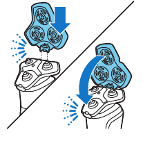 - Vuelva a colocar los anillos de retención en los cabezales de afeitado y gírelos en el sentido de las agujas del reloj para volver a fijarlos.