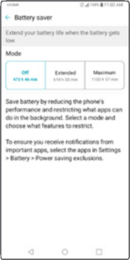- Toca el modo Extendido (Extended) o el modo Máximo (Maximum) para ayudar a extender la duración de tu batería.*