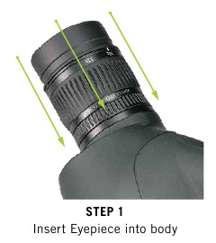 Si desea utilizar el estuche de neopreno incluido, coloque el estuche de neopreno en el telescopio terrestre antes de fijar el ocular. Antes de fijar el ocular, retire cualquier cubierta que pueda interferir con la fijación al cuerpo del telescopio terrestre. Mantenga las cubiertas de las lentes exteriores a mano para proteger las lentes expuestas siempre que no esté mirando a través del telescopio terrestre Viper® HD.