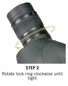 - Para fijar el ocular, inserte el ocular en el cuerpo y gírelo en el sentido de las agujas del reloj utilizando el anillo de bloqueo del ocular hasta que el ocular esté apretado (deja de girar).