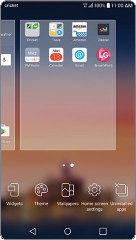 Personaliza tu pantalla de inicio con aplicaciones, widgets y fondos de pantalla. Mantén pulsada una parte en blanco de la pantalla de inicio para acceder a las opciones de personalización, luego selecciona Widgets, Tema (Theme), Fondos de pantalla (Wallpapers), Ajustes de la pantalla de inicio (Home screen settings) o Aplicaciones desinstaladas (Uninstalled apps). Explora las opciones deslizando para desplazarte y toca o arrastra un elemento para agregarlo a una pantalla de inicio.