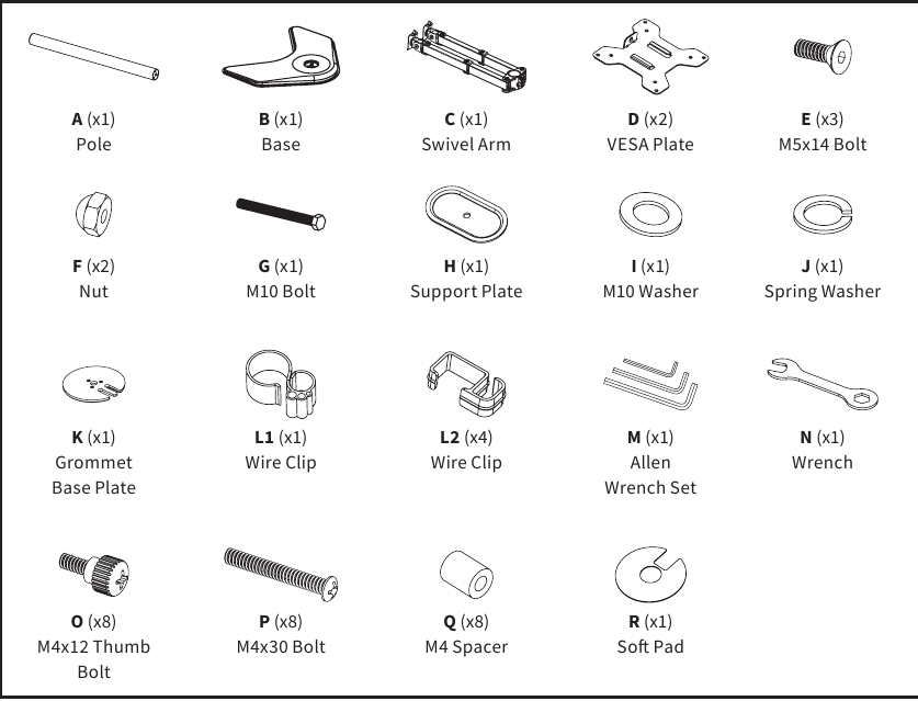 Coloque la placa VESA (D) al monitor utilizando los espaciadores M4 (Q) y los pernos M4x30 (P).