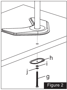 OPCIONAL: Para un montaje más seguro, puede perforar un orificio de 10 mm de diámetro en su escritorio y fijarlo utilizando la placa de soporte (H), la arandela M10 (I), la arandela elástica (J) y el perno M10 (G). Apriete el perno M10 con la llave suministrada (N), consulte la figura 2.