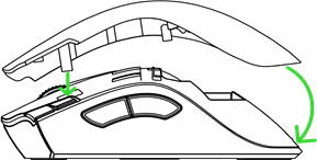 - Empuja el interruptor deslizante al modo inalámbrico Razer™ HyperSpeed (2,4 GHz). Cuando esté conectado, el indicador de estado se pondrá brevemente en verde fijo.