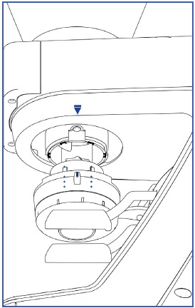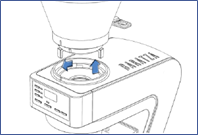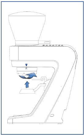 - Kui veski on täielikult tühjendatud, pöörake jahvatuse reguleerimisseadet jämedamast seadest kaugemale paigaldus-/eemaldamisindikaatorini (sinine kolmnurk). Seade vabaneb eemaldamiseks allapoole (joonis E).