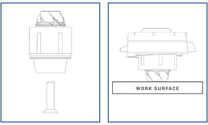 - Asetage kooniline tera ja hoidik letile nii, et tera toetuks tööpinnale. Asetage reguleerimisrõngas (ribiline osa allapoole) peale ja vajutage reguleerimisseade kindlalt koonilisele terale ja hoidikule (joonis L).