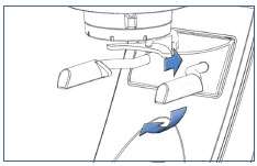Seadme hoidiku portafiltri hoidiku asendisse muutmiseks vajutage parempoolset kätt sisse ja keerake seda alla ja vasakule, kuni see klõpsatab oma kohale (joonis A).