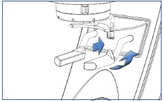 - Hoides kahte sinist indikaatorit joondatud, vajutage õrnalt jahvatuse reguleerimisseadet ülespoole ja pöörake musta koonilise tera hoidikut (joonis G), kuni sakid ja sisselõiked joondavad ning koonilise tera hoidik libiseb masinasse üles.