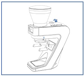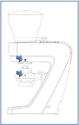 Kui jahvatate otse portafiltrisse, peate esmalt muutma käed portafiltri hoidiku asendisse ja keerama konksu ette. Konks on mõeldud teie portafiltri ülemise joonise A serva toetamiseks, samal ajal kui käed toetavad teie portafiltri põhja. On hädavajalik, et konks oleks reguleeritud nii, et portafilter istuks tasasel pinnal. Konksu reguleerimiseks keerake lahti 2 mm kuuskantkruvi, mis asub konksu all, reguleerige portafiltri konksu üles või alla ja pingutage kruvi, kui see on õiges asendis. Pärast konksu reguleerimist tehke proovijahvatus. Kui portafilter ei istu jahvatusprotsessi ajal tasasel pinnal, võib vaja minna täiendavaid reguleerimisi.