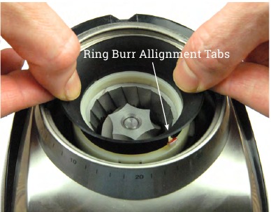 Tõmmake silikoontihend rõngastera pealt ära. Eemaldage rõngastera, tõstes selle tõstekaartide abil otse veskist välja. Kui tera ei tule välja, veenduge, et jahvatusastme reguleerimisrõngas on täielikult vastupäeva keeratud.