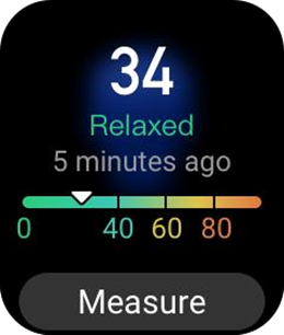 Kell pakub Stress (Stress) rakendust teie stressi väärtuse mõõtmiseks. Kui mõõtmine on edukas, kuvab kell mõõdetud stressi väärtuse ja stressi oleku. Kui mõõtmine ebaõnnestub, kuvatakse teade "Measurement failed" (Mõõtmine ebaõnnestus). Eduka mõõtmise tagamiseks kandke kella õigesti ja püsige mõõtmise ajal paigal.