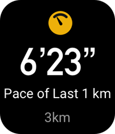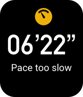Kui teie reaalajas tempo on treenimise ajal madalam kui eelmääratud väärtus, vibreerib kell, et teid teavitada, et teie tempo on liiga madal, ja kuvab teie praeguse tempo. Enne kui kasutate funktsiooni Pace too slow alert (Tempo liiga aeglane hoiatus), minge Workout Settings (Treeningu seadete) ekraanile, et lülitada sisse Pace Reminder (Tempo meeldetuletus).