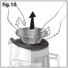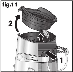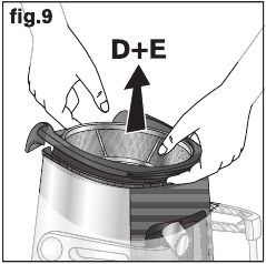 - Filtri eemaldamiseks vabastage see, tõmmates mõlema käega (vt joonised 9 ja 10). Seejärel eemaldage roostevabast terasest filtrikorv (D) ja seejärel mahlakoguja (E) (vt joonised 10 ja 11).
