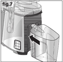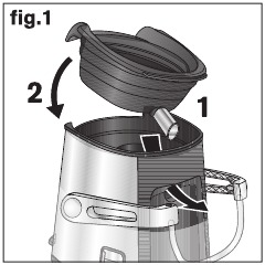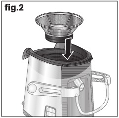 - Kui viljalihakoguja (G) on täis või mahla vool aeglustub, tühjendage viljalihakoguja ning puhastage filtrikorv ja kaas.