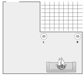 Näide 3: Nagu näites 2, on üks kõlar paigutatud vastu seina ja teine nurka. Ruumi kujul ei ole seadetele mingit mõju.