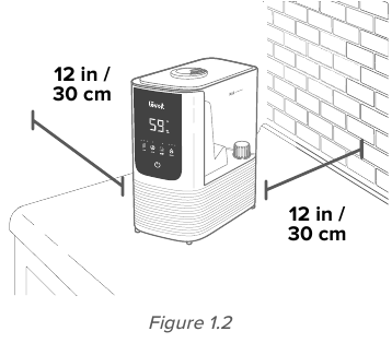 - If the humidifier is placed within 12 inches / 30 cm of a wall or in a corner, the humidity sensor cannot provide a proper reading for the relative humidity in the room.(Kui niisutaja asetatakse seinast või nurgast 12 tolli / 30 cm kaugusele, ei saa niiskusandur anda ruumi suhtelise õhuniiskuse kohta õiget näitu.)