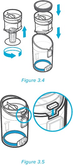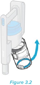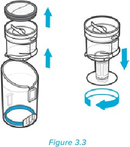 - Eemaldage ketasfilter ja tõmmake sisemine kamber tolmukonteinerist välja. Keerake põhjas olevat sakki päripäeva, et eemaldada tassifilter [Joonis 3.3]. Tühjendage ülejäänud mustus.