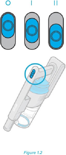 - Lükake sisse/välja nupp ettepoole, et tolmuimeja sisse lülitada. Lükake nupp asendisse I kõvade põrandate jaoks või asendisse II vaipade jaoks [Joonis 1.2].