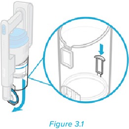 - Tolmukonteineri tühjendamiseks eemaldage vars, vajutades tolmuimeja korpuse vabastusnuppu.