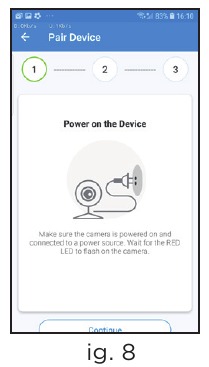 - Vajutage ja hoidke all kaamera küljel olevat nuppu PAIR, kuulete häälsõnumit "Ready for Pairing" (Valmis paarimiseks), seejärel puudutage Continue (Jätka) (joonis 9).