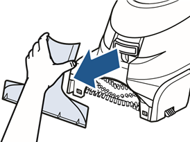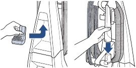 | Irrotettava suutin ei ehkä ole kunnolla kiinni. | Varmista, että suutin on oikein paikallaan nostamalla hieman koneen etuosaa, jotta koneen pohjan kummallakin puolella olevat aukot kohdistuvat suuttimen kummallakin puolella oleviin koukkuihin. Kiinnitä ensin pohjaan ja napsauta sitten suutin paikalleen. | ||