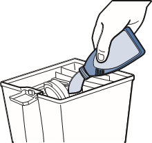 - Täytä mukana toimitettu mittakuppi pesuaineella täyttöviivaan asti ja kaada se rakkoon.