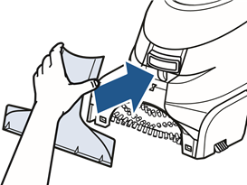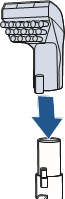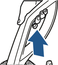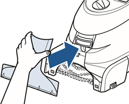 - Kun olet valmis, aseta suutin takaisin paikalleen nostamalla hieman koneen etuosaa, jotta pohjan kummallakin puolella olevat aukot kohdistuvat suuttimen koukkuihin. Työnnä eteenpäin, kunnes suutin napsahtaa paikalleen.