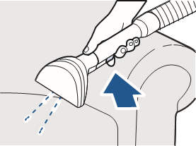 - Pidä työkalua noin 2,5–5 cm:n päässä likaisesta pinnasta. Paina suihkuliipaisinta levittääksesi puhdistusliuosta. Vapauta liipaisin, paina alaspäin ja vedä itseäsi kohti imeäksesi lian ja puhdistusliuoksen. Älä kastele liikaa.
