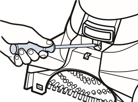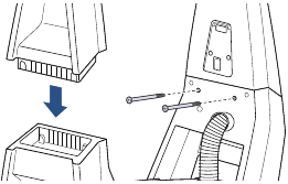 - Kiinnitä yläletkun/johdon kääre kahvan takaosaan työntämällä koukku uraan ja painamalla ylöspäin, kunnes se on tasaisesti koneen takaosan kanssa. Kiinnitä kääreen pohja koneeseen yhdellä lyhyellä ruuvilla.