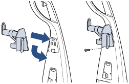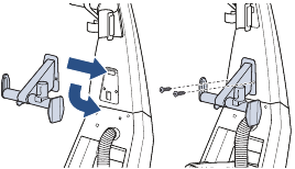 - Kiinnitä alempi letkun/johdon kääre työntämällä koukku uraan ja painamalla ylöspäin, kunnes se on tasaisesti koneen takaosan kanssa. Kiinnitä alempi letkun/johdon kääre kahdella lyhyellä ruuvilla.
