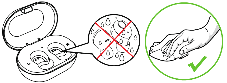 Jos pinnalla on vesipisaroita, pyyhi ne kuivalla liinalla ennen kuin asetat ne takaisin latauskoteloon, jotta laite ei vahingoitu.
