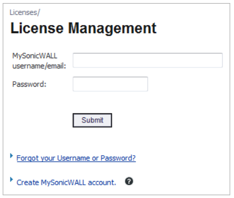 - Kirjaudu sisään MySonicWALL-tilisi nimellä ja salasanalla. Jos sinulla ei ole MySonicWALL-tiliä, luo tili napsauttamalla Create MySonicWALL account (Luo MySonicWALL -tili) -linkkiä.