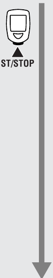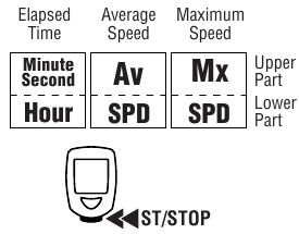 Voit siirtää Kulunut aika, Keskiarvo ja Maksiminopeus -näytöt ylempään näyttöön katselun helpottamiseksi. Pidä START/STOP (aloita/lopeta) -painiketta painettuna 2 sekuntia ja alinäyttö tulee näkyviin ylemmässä näytössä. Pidä START/STOP (aloita/lopeta) -painiketta uudelleen painettuna 2 sekuntia ja näyttö palaa normaaliin asetukseen.