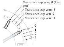 Vuosi vastaa karkausvuoden jälkeisiä vuosia ja se ilmoitetaan sekuntiosoittimen asennolla.