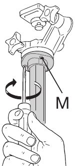 Nosta sitten keskiputkea ja kiristä pienellä ruuvimeisselillä kolme ruuvia "M" (toimitetaan irrallaan) päätä vasten varoen kiristämästä niitä liikaa. Tämä ainutlaatuinen ominaisuus toimii erityisen hyvin Manfrotto-päiden kanssa niiden erityisesti suunnitellun pohjan ansiosta, joka estää pään irtoamisen vahingossa. Irrota pää löysäämällä ruuvit "M" ja irrota pää putkesta vastapäivään).