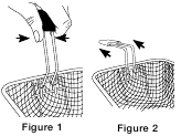 - Kiinnitä kahva oikein koriin puristamalla kahvan molemmat päät yhteen ja asettamalla molemmat päät kannattimen reikiin (kuva 1). Pidä päät kannattimen rei'issä ja vapauta ote varovasti. Vedä kahvaa tiukasti taaksepäin, jotta se napsahtaa paikalleen (kuva 2).