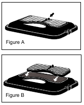 Poista suodatin painamalla suodattimen kannen takana olevaa yksittäistä kielekettä itseäsi kohti ja nostamalla kansi ulos kannen etuosassa olevista aukoista (kuva A).