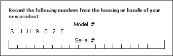 Kun otat yhteyttä yritykseen tai tilaat osia uudelleen, sinun on ilmoitettava tuotteesi malli- ja sarjanumerot. Ne löytyvät sähkövarsipensasleikkurisi koteloon tai kahvaan kiinnitetystä tarrasta. Kopioi nämä numerot alla olevaan tilaan.