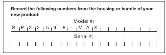 Kun otat yhteyttä yritykseen, tilaat osia uudelleen tai järjestät huoltoa valtuutetulta jälleenmyyjältä, sinun on ilmoitettava malli- ja sarjanumerot, jotka löytyvät laitteen kotelossa olevasta tarrasta. Kopioi nämä numerot alla olevaan tilaan.