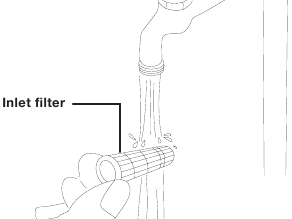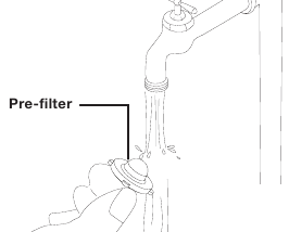 - Hyvän suorituskyvyn varmistamiseksi tarkista ja puhdista veden sisääntulosuodatin. Irrota esisuodatin ja veden sisääntulosuodatin ja huuhtele lämpimällä vedellä, jotta vieraat aineet eivät tuki pumppua.