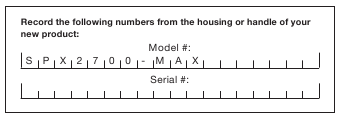Kun otat yhteyttä yritykseen, tilaat osia uudelleen tai järjestät huoltoa valtuutetulta jälleenmyyjältä, sinun on ilmoitettava malli- ja sarjanumerot, jotka löytyvät laitteen kotelossa olevasta tarrasta. Kopioi nämä numerot alla olevaan tilaan.
